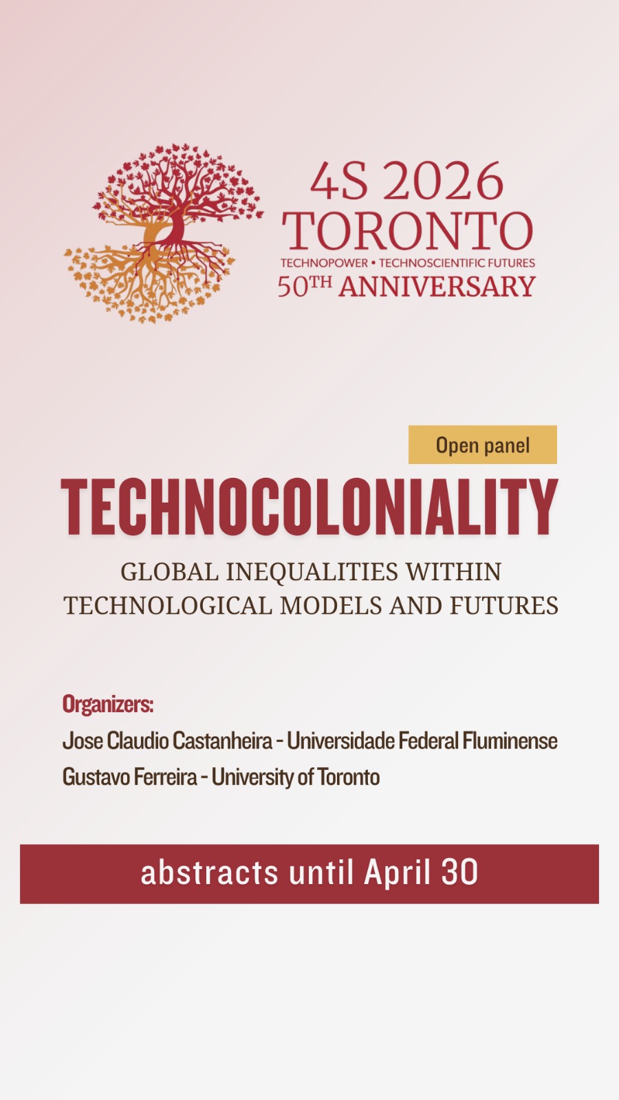 Professor Gustavo Ferreira from the University of Toronto and I are coordinating a panel at the 4S 2026 – TECHNOPOWER – TECHNOSCIENTIFIC FUTURES meeting, organized by the SOCIETY FOR SOCIAL STUDIES OF SCIENCE. The meeting will take place from October 7th to 10th in Toronto, Canada. Below is a description of the panel and the link for submitting abstracts of up to 250 words: